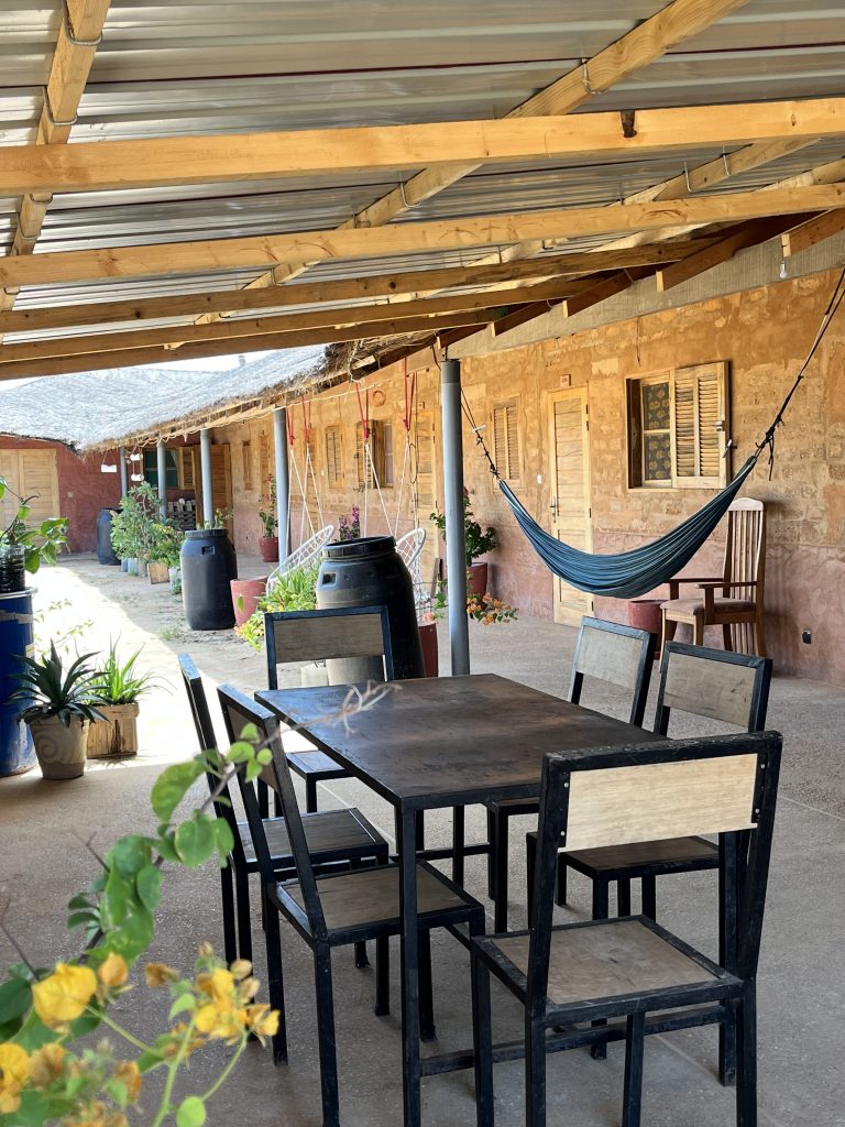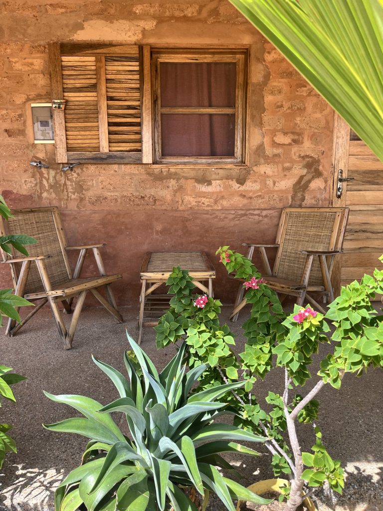 Les chambres sont toutes équipées de ventilateurs. Mar Lodj sera très prochainement raccordée au réseau mais pour l’heure, Mbin Maak est uniquement équipé de panneaux photovoltaïques pour les besoins du quotidien. Nous avons également un accès wi-fi.